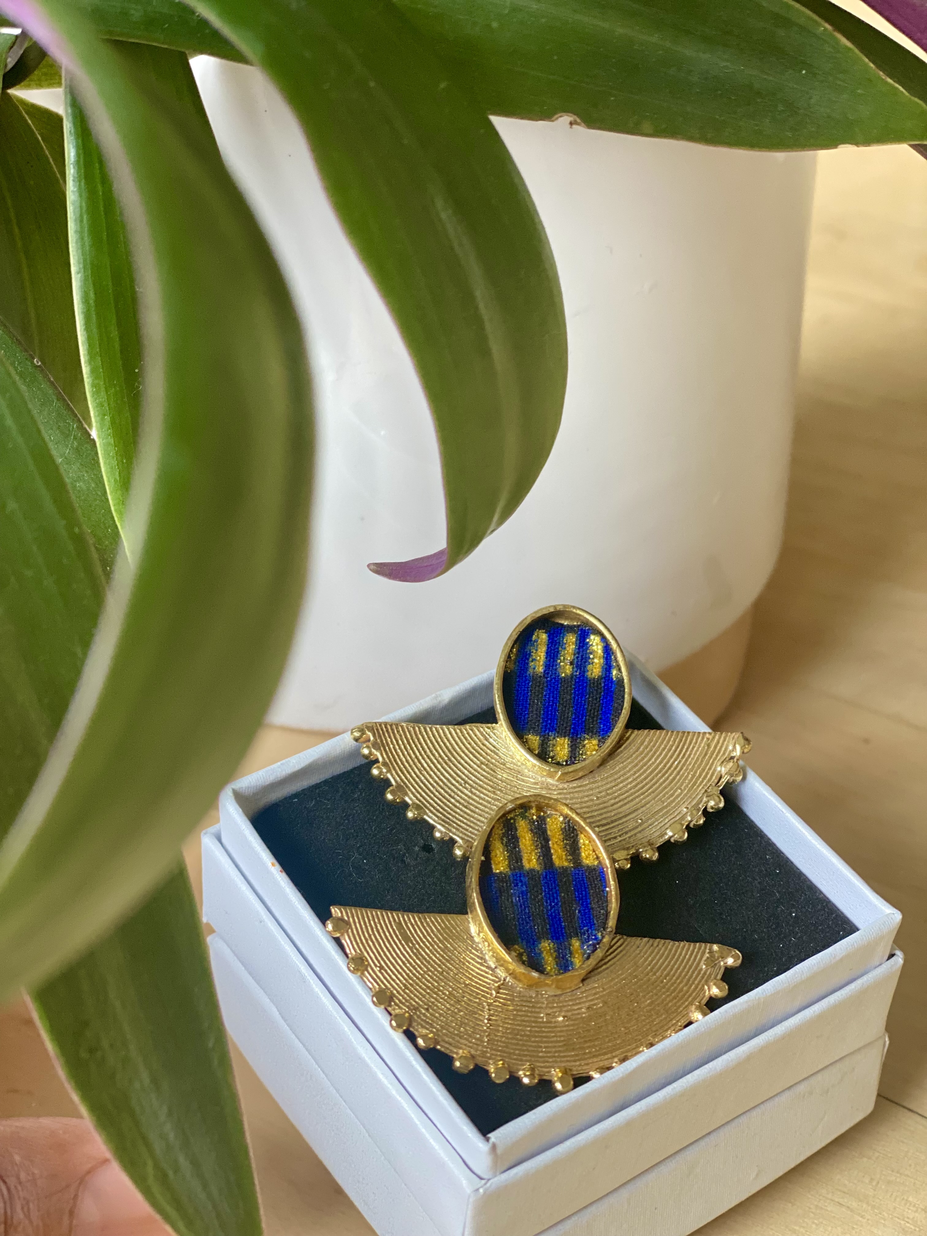 Nous créons ces Boucles d’oreille bronze “Awa” violet et or à partir des célèbres poids Akan de Côte d’Ivoire. D’abord, un artisan Sénégalais façonne le bronze avec un savoir-faire méticuleux. L’objet démontre une performance artisanale éprouvée. Ces poids étaient autrefois des étalons de commerce. Maintenant, ils deviennent de précieux accessoires de mode chargés d’histoire. De plus, l’ajout du wax élégant avec ses touches dorées apporte un éclat unique. Ce motif renforce l’aspect audacieux de la parure. Le choix du violet symbolise la noblesse et l’unicité du patrimoine que vous portez. Chaque détail du bronze est ciselé avec soin.